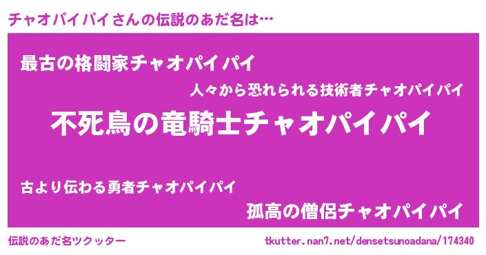 | 男性向けラノベタイトル風あだ名 | 『チャオパイパイの憂鬱』 |
