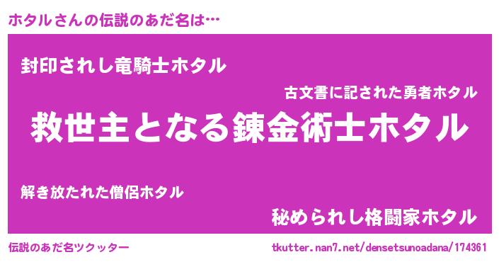 | 胡散臭い通販商品みたいなあだ名 | 『あなたにだけ特別に提供する世界で10本だけ現存している希少なブランデー…その名も「ホタル」』 |