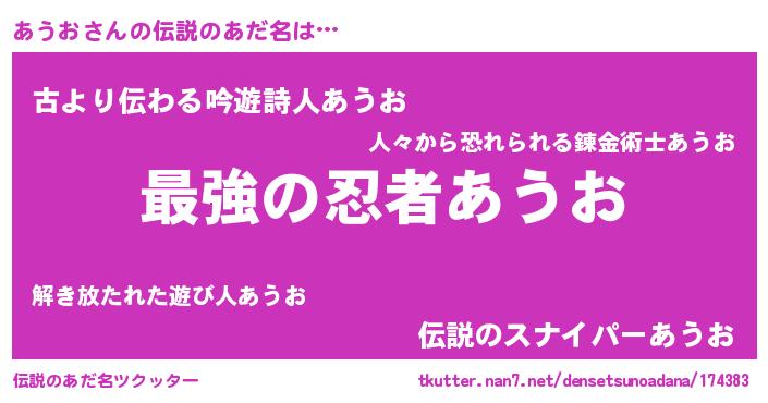 | ヒーロー風カッコイイあだ名 | 『ウルトラあうおマン』『ネオアウオ』 |