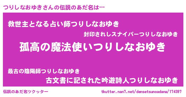 | 胡散臭い通販商品みたいなあだ名 | 『信頼と実績のサプリメント…その名も「つりしなおゆき」』 |