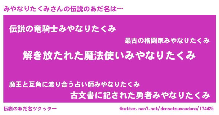 | ポケモン風あだ名 | 『ヒミヤナリタクミ』『ミヤセウス』 |