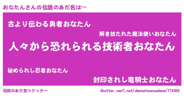 | 男性向けラノベタイトル風あだ名 | 『おまえをオタクにしてやるから、俺をおなたんにしてくれ! 』 |