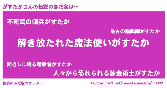 | 男性向けラノベタイトル風あだ名 | 『Re:がすたかから始める異世界生活』 |