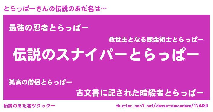 | 男性向けラノベタイトル風あだ名 | 『とらっぱーの憂鬱』 |
