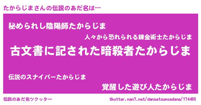 | ヒーロー風カッコイイあだ名 | 『ネオタカラジマ』『仮面タカダー』 |
