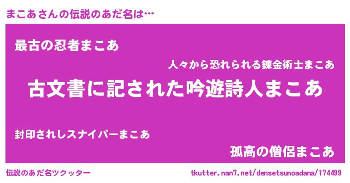 | ヒーロー風カッコイイあだ名 | 『ネオマコア』『ウルトラまこあマン』 |
