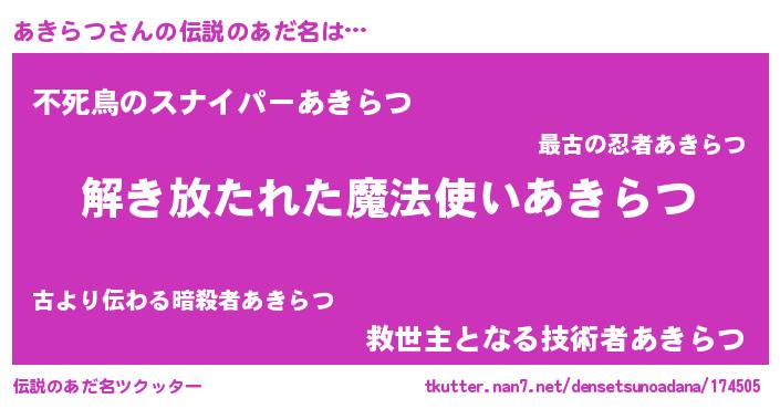 | 男性向けラノベタイトル風あだ名 | 『転生したらあきらつだった件』 |