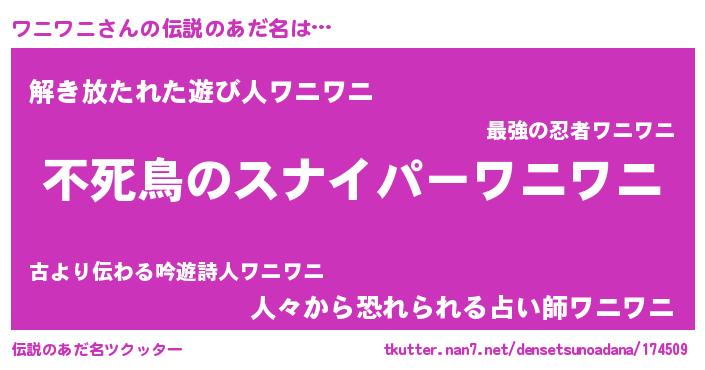 | 男性向けラノベタイトル風あだ名 | 『ワニワニの憂鬱』『ワニワニスレイヤー』 |