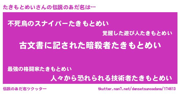 | ヘコむあだ名 | 『たきもとめい(笑)』『たきっふぃ~』 |