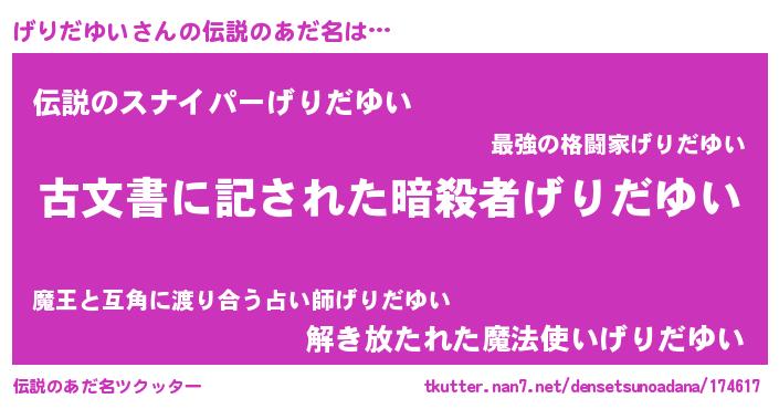 | ヒーロー風カッコイイあだ名 | 『ネオゲリダユイ』『スーパーゲリダユイ』 |