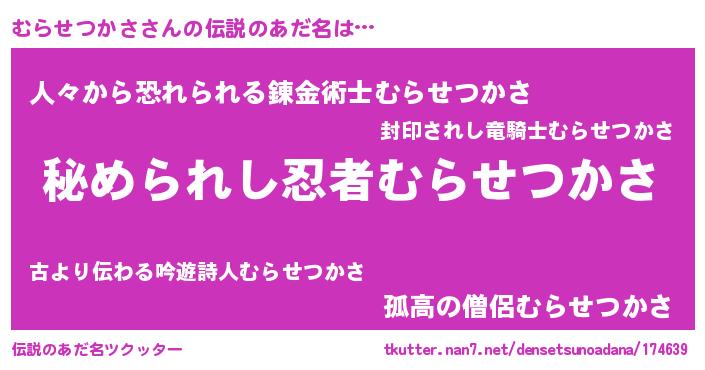 | 意味不明あだ名 | 『自称むらせつかさ』 |