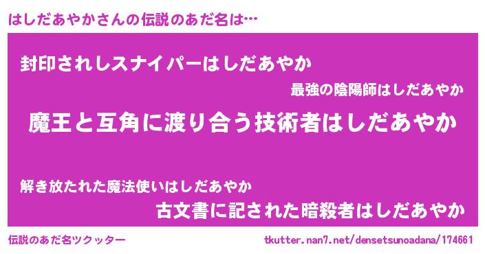 | ヒーロー風カッコイイあだ名 | 『愛の使者はしだあやか』『仮面ハシダー』 |