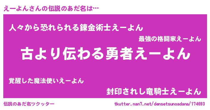 | 男性向けラノベタイトル風あだ名 | 『転生したらえーよんだった件』 |