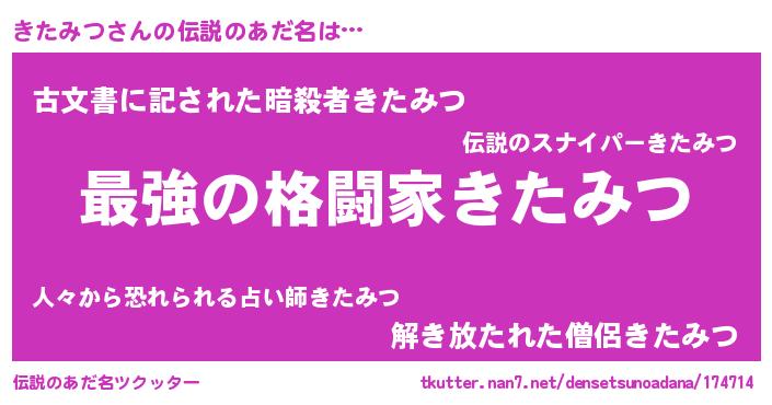| 男性向けラノベタイトル風あだ名 | 『きたみつに滅ぼされるだけの簡単なお仕事です』 |