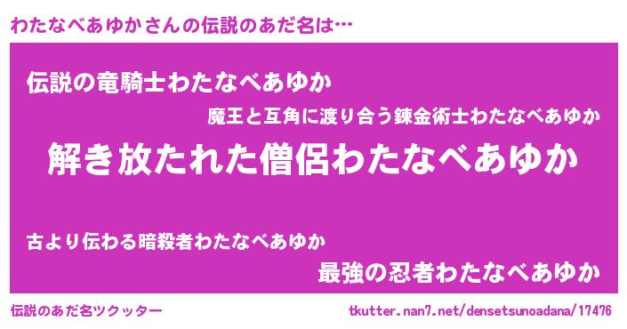 | 女子向けラノベタイトル風あだ名 | 『乙女ゲームの破滅フラグしかない悪役わたなべあゆかに転生してしまった…』 |