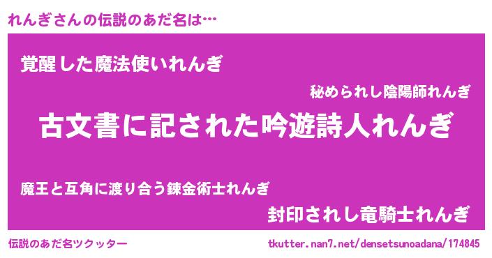 | 意味不明あだ名 | 『自称れんぎ』『もやし科れんぎ属』 |