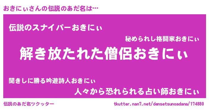 | 男性向けラノベタイトル風あだ名 | 『ダンジョンにおきにぃを求めるのは間違っているだろうか』 |
