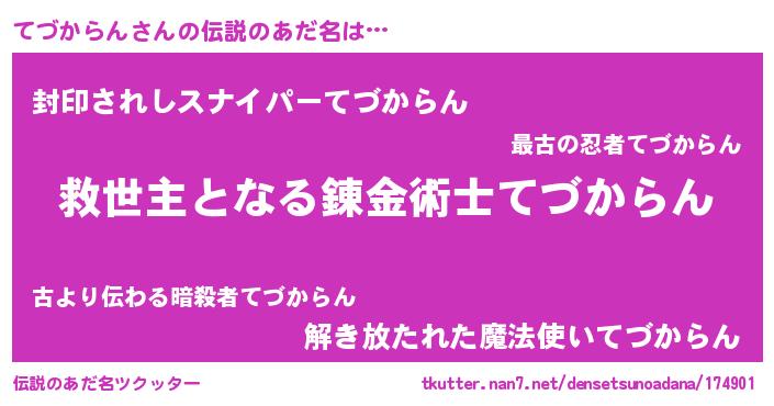 | ヒーロー風カッコイイあだ名 | 『天空の使者てづからん』『幻影騎士テヅ』 |