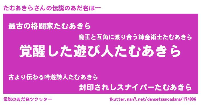 | 男性向けラノベタイトル風あだ名 | 『たむあきらの嫁は女の子じゃないと思った?』 |