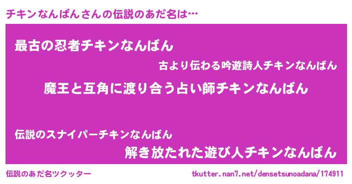 | ヒーロー風カッコイイあだ名 | 『仮面チキダー』『炎刃騎士チキ』 |