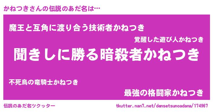 | 意味不明あだ名 | 『自称かねつき』『永久保存かねつき』 |