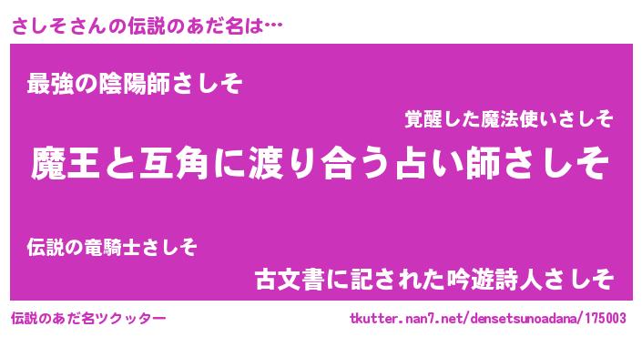 | 男性向けラノベタイトル風あだ名 | 『Re:さしそから始める異世界生活』 |
