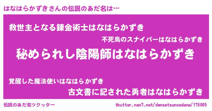 | 男性向けラノベタイトル風あだ名 | 『ハナハラカズキスレイヤー』 |