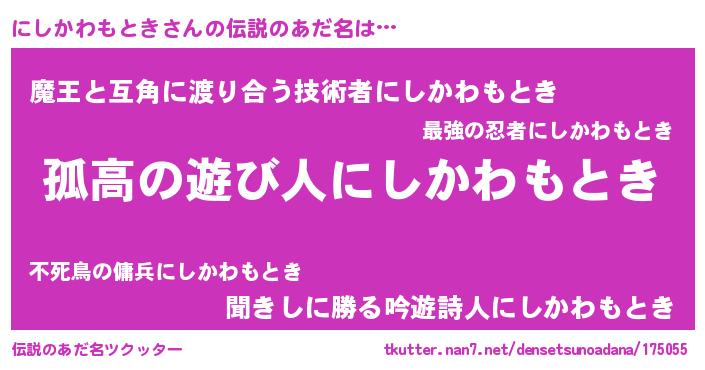 | 男性向けラノベタイトル風あだ名 | 『ダンジョンににしかわもときを求めるのは間違っているだろうか』 |