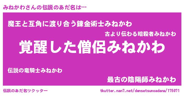 | 男性向けラノベタイトル風あだ名 | 『みねかわの嫁は女の子じゃないと思った?』 |