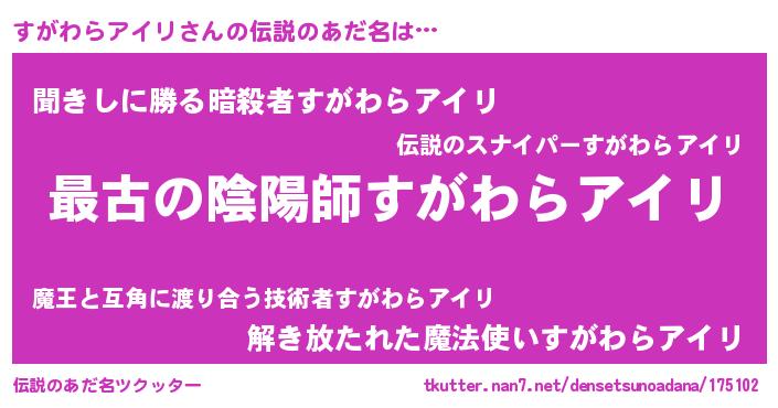 | ヒーロー風カッコイイあだ名 | 『仮面スガダー』『ネオスガワラアイリ』 |