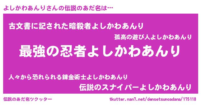 | 胡散臭い通販商品みたいなあだ名 | 『あなたにだけ特別に提供する限定10本のレアな日本酒…その名も「よしかわあんり」』 |