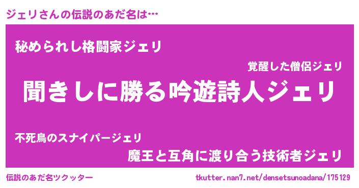 | 男性向けラノベタイトル風あだ名 | 『ジェリという概念が存在しない退屈な世界 』 |