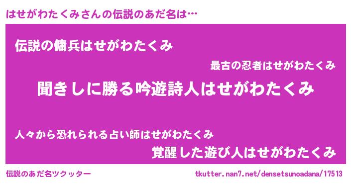 | 意味不明あだ名 | 『めかぶ科はせがわたくみ属』 |