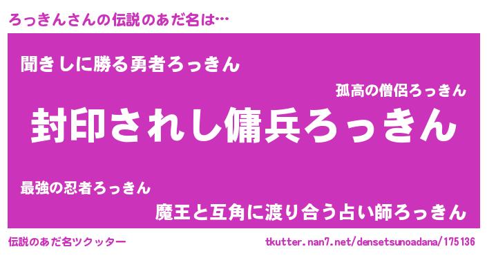 | 男性向けラノベタイトル風あだ名 | 『Re:ろっきんから始める異世界生活』 |