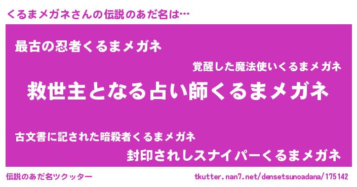 | 男性向けラノベタイトル風あだ名 | 『くるまメガネに滅ぼされるだけの簡単なお仕事です』 |
