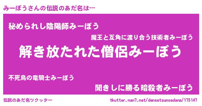 | 男性向けラノベタイトル風あだ名 | 『この素晴らしい世界にみーぼうを!』 |