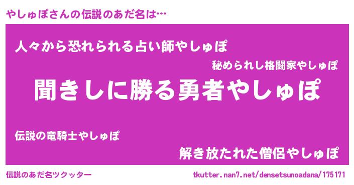 | 意味不明あだ名 | 『永久保存やしゅぽ』『自称やしゅぽ』 |