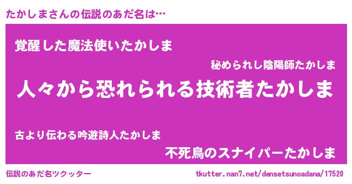 | ヒーロー風カッコイイあだ名 | 『友情の使者たかしま』『炎刃騎士タカ』 |