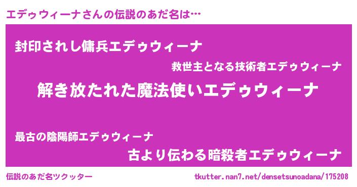 | 男性向けラノベタイトル風あだ名 | 『ダンジョンにエデゥウィーナを求めるのは間違っているだろうか』 |