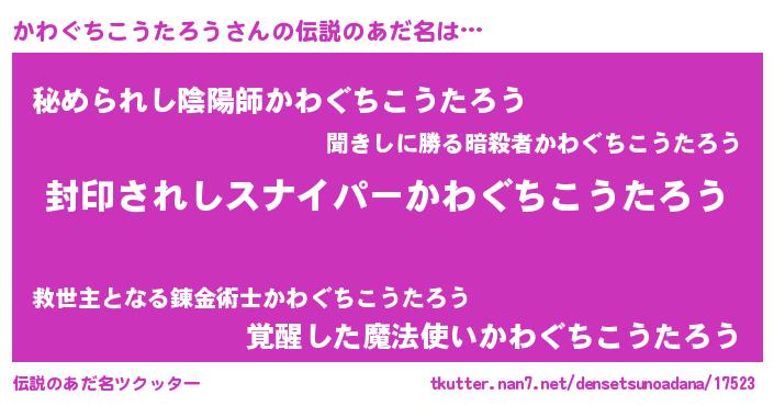 | 男性向けラノベタイトル風あだ名 | 『カワグチコウタロウアートオンライン』 |