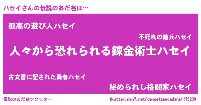 | 男性向けラノベタイトル風あだ名 | 『おまえをオタクにしてやるから、俺をハセイにしてくれ! 』 |