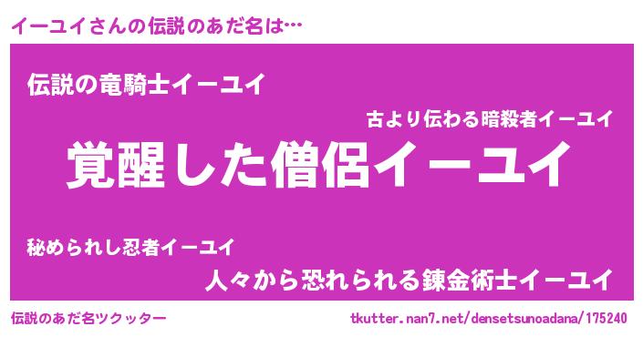 | ヒーロー風カッコイイあだ名 | 『天弓騎士イー』『スーパーイーユイ』 |
