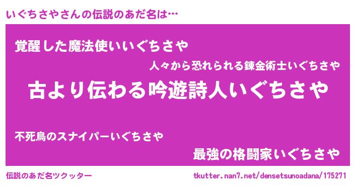 | 男性向けラノベタイトル風あだ名 | 『いぐちさやに滅ぼされるだけの簡単なお仕事です』 |