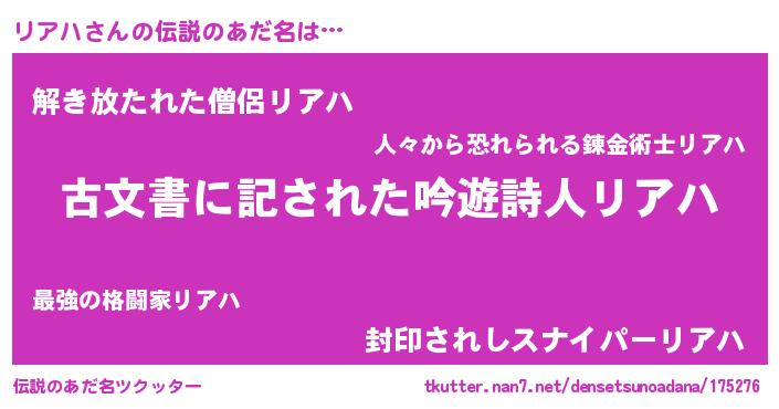 | 意味不明あだ名 | 『永久保存リアハ』『ペロリンリアハ』 |