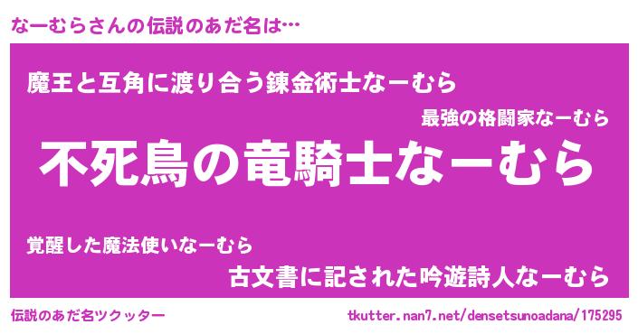 女子向けラノベタイトル風あだ名 | 『なーむら姫と円卓の騎士』 |