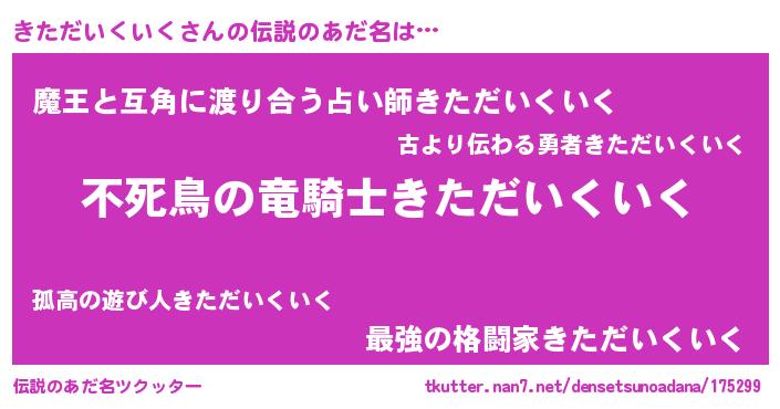 | 女子向けラノベタイトル風あだ名 | 『きただいくいく姫と円卓の騎士』 |
