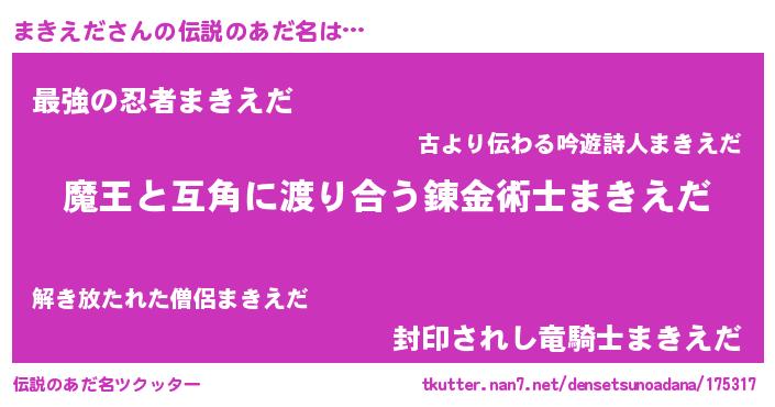 | 男性向けラノベタイトル風あだ名 | 『まきえだに滅ぼされるだけの簡単なお仕事です』 |