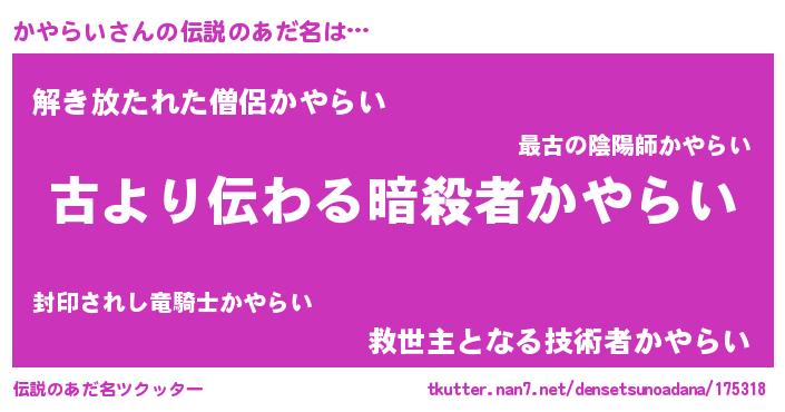| 意味不明あだ名 | 『自称かやらい』『永久保存かやらい』 |