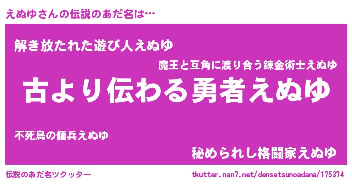 | 意味不明あだ名 | 『永久保存えぬゆ』『エリンギ科えぬゆ属』 |