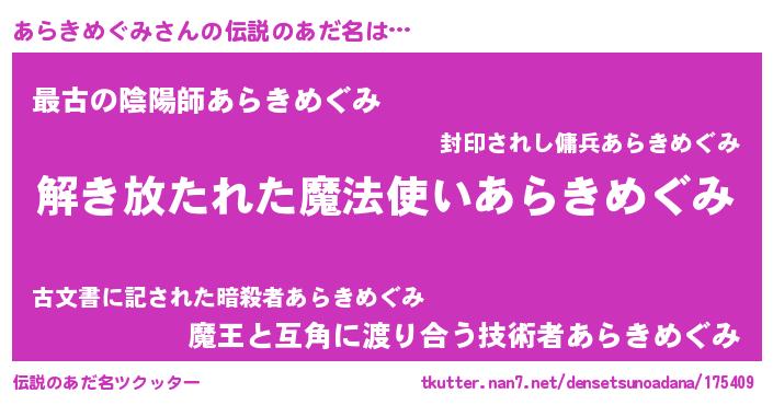 | 男性向けラノベタイトル風あだ名 | 『あらきめぐみの嫁は女の子じゃないと思った?』 |